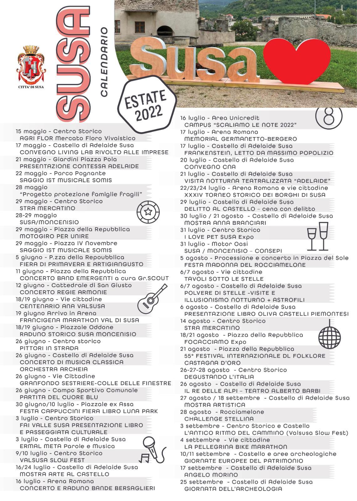 Calendario con tutti gli appuntamenti a Susa dal 15 maggio al 25 settembre 2022
