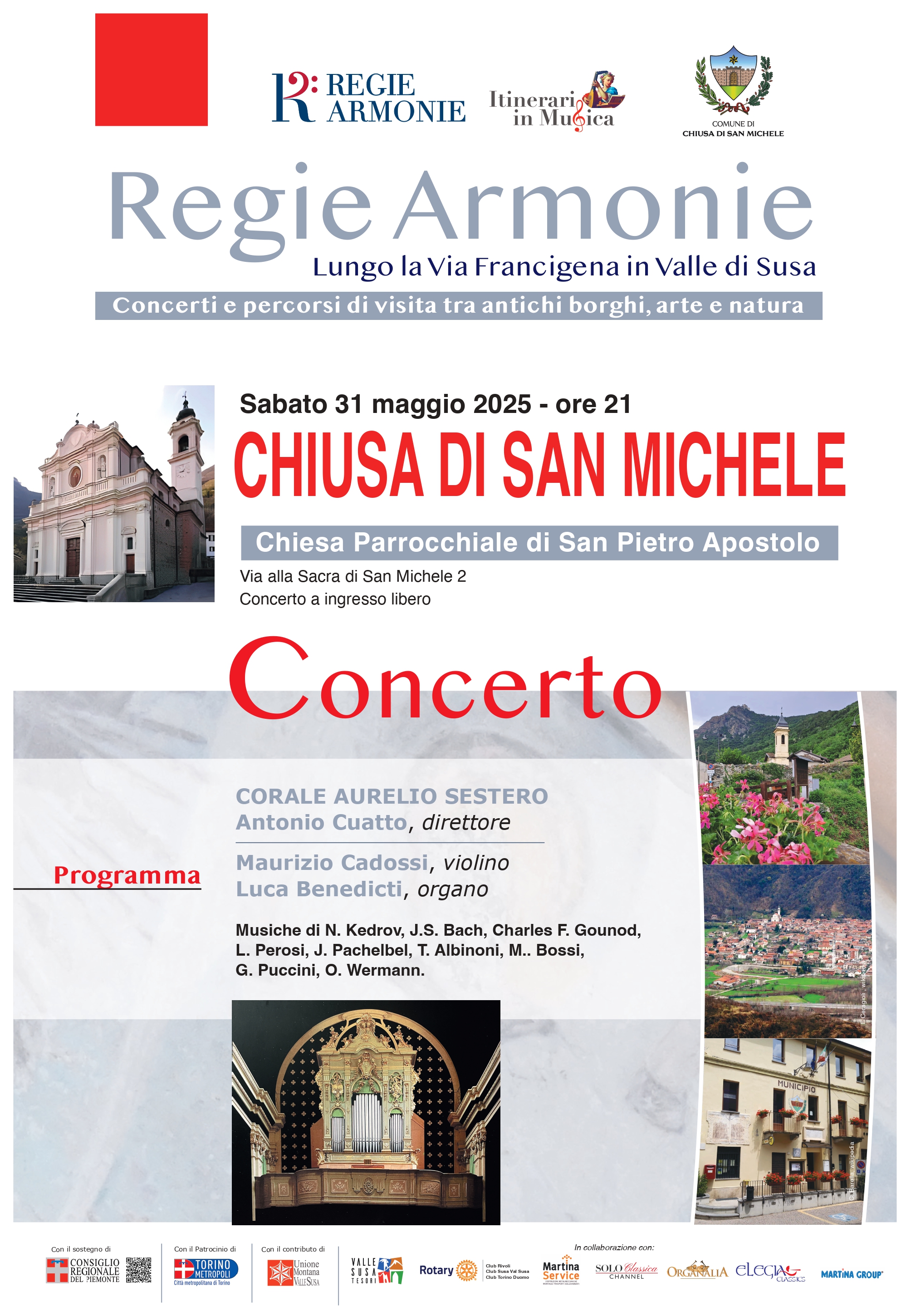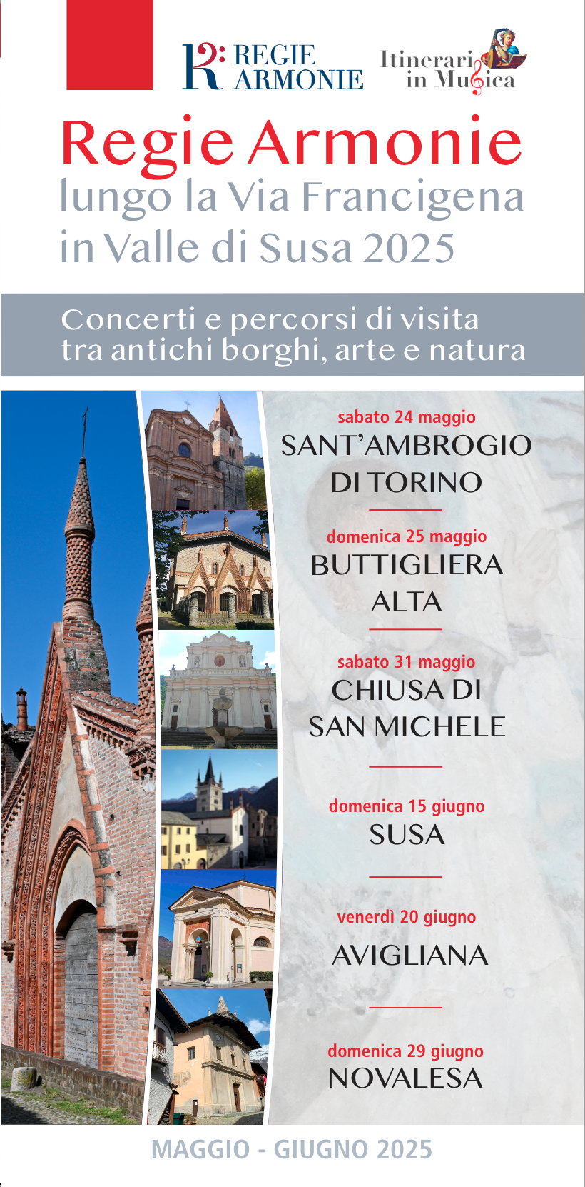 Ripartiranno sabato 24 maggio, a Sant’Ambrogio di Torino, e domenica 25 a Buttigliera Alta i concerti dell’edizione 2025 di “Regie Armonie Lungo la Via Francigena”: appuntamenti musicali e percorsi di visita tra antichi borghi, arte e cultura. Un progetto di Itinerari In Musica per valorizzare e riscoprire il patrimonio storico, artistico e culturale del territorio in modo inclusivo e adatto ad un pubblico ampio e variegato.