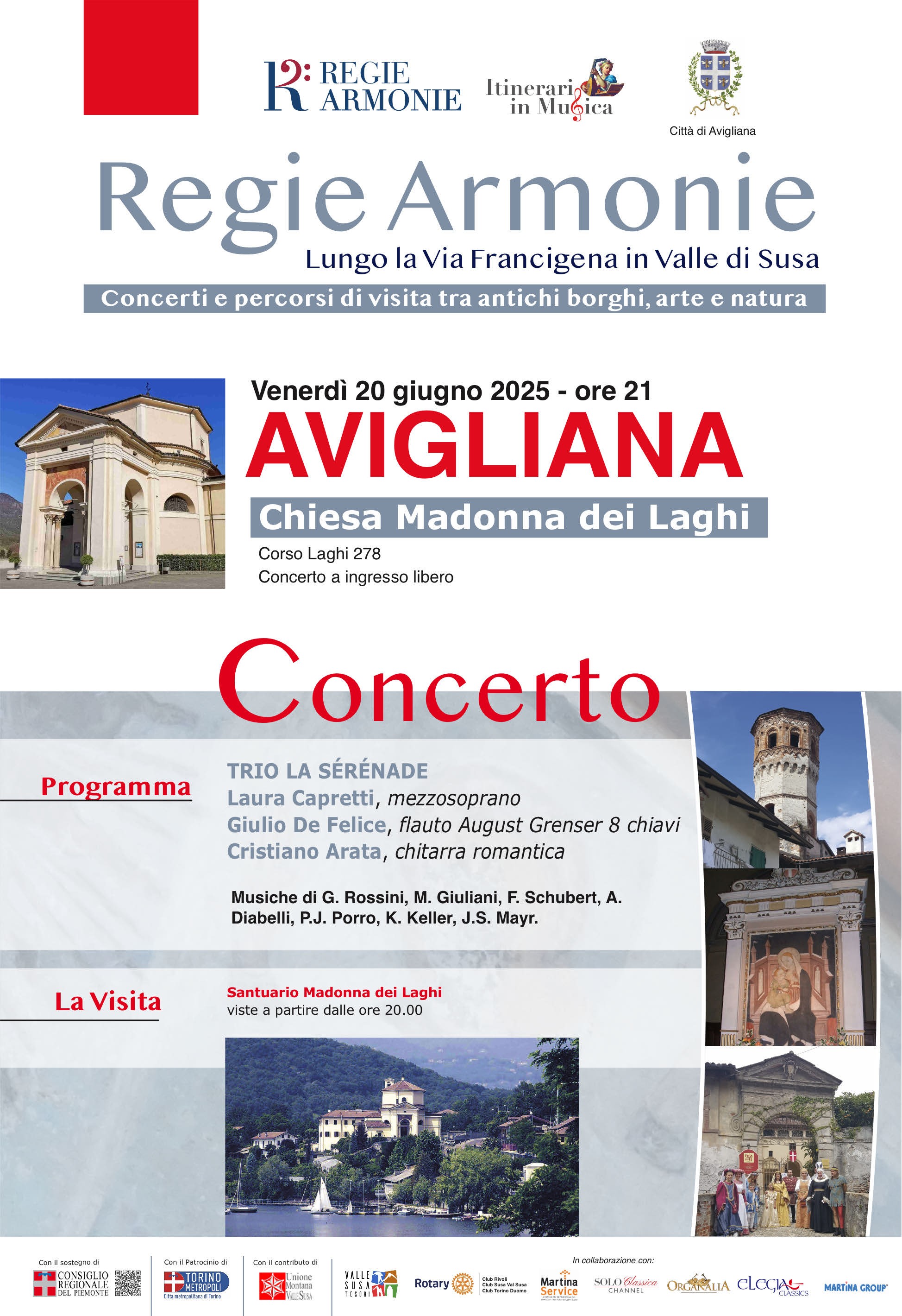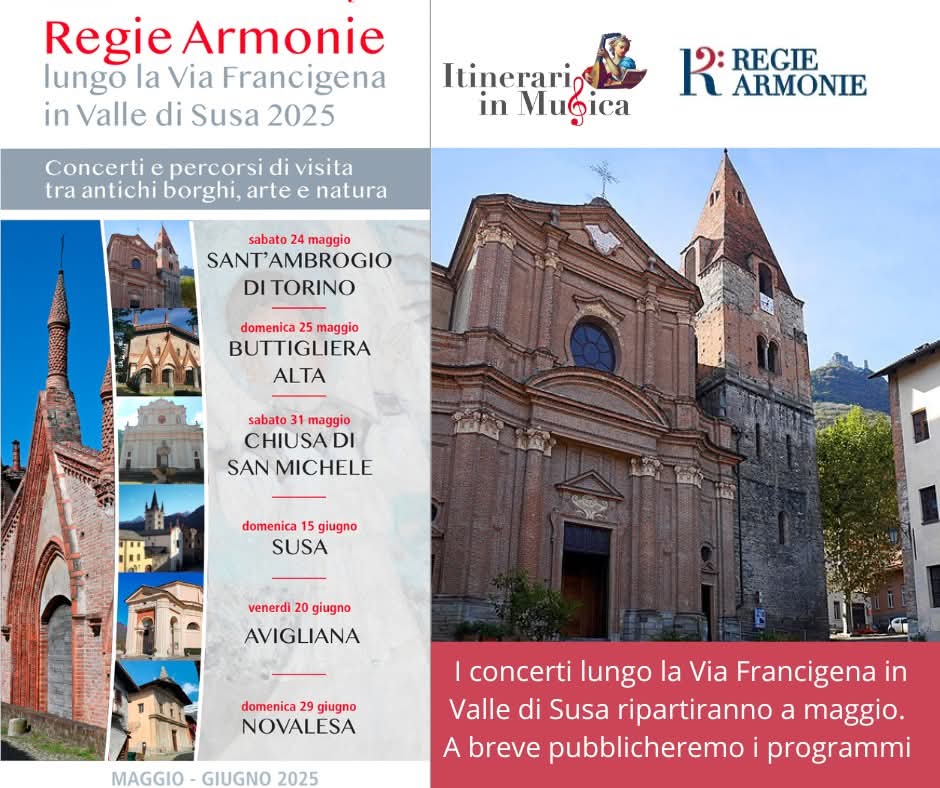 Ripartiranno sabato 24 maggio, a Sant’Ambrogio di Torino, e domenica 25 a Buttigliera Alta i concerti dell’edizione 2025 di “Regie Armonie Lungo la Via Francigena”: appuntamenti musicali e percorsi di visita tra antichi borghi, arte e cultura. Un progetto di Itinerari In Musica per valorizzare e riscoprire il patrimonio storico, artistico e culturale del territorio in modo inclusivo e adatto ad un pubblico ampio e variegato.