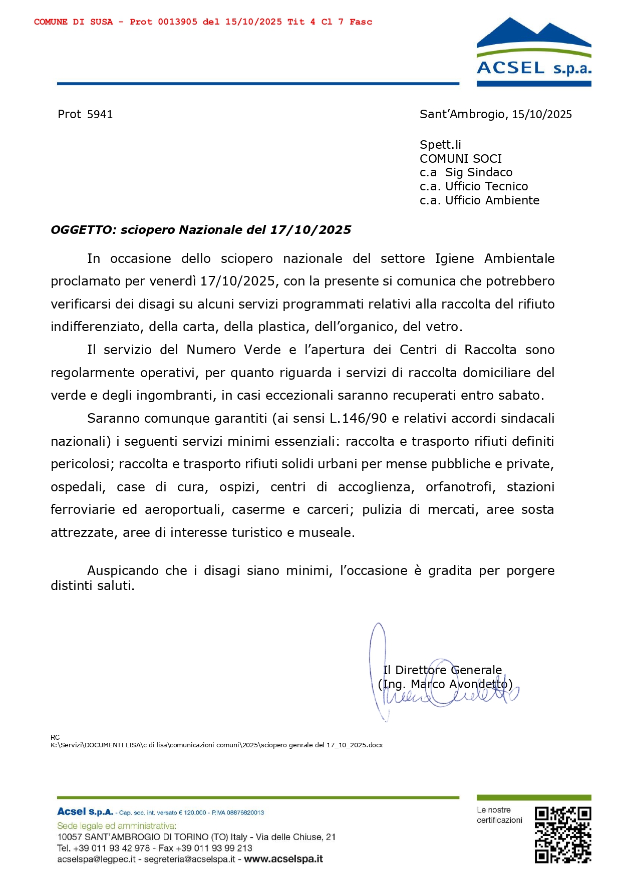 Si comunica all'utenza che VENERDÌ 17 OTTOBRE 2025, in occasione dello sciopero generale nazionale del settore Igiene Ambientale, potrebbero verificarsi dei disagi su alcuni servizi programmati relativi alla raccolta del rifiuto indifferenziato, della carta, della plastica, dell'organico e del vetro.