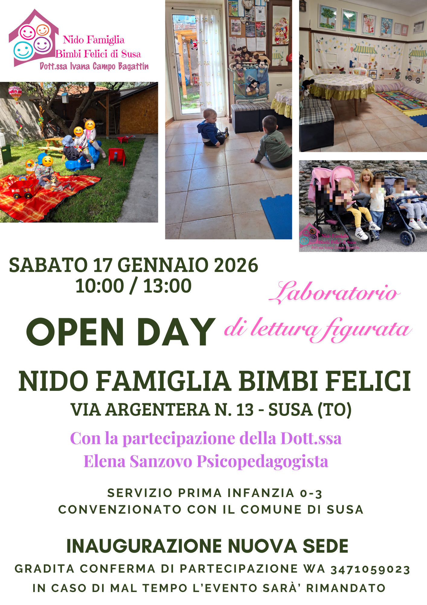 Il nido in famiglia Bimbi Felici, convenzionato con il Comune di Susa, svolgerà un open day sabato 17 gennaio dalle ore 10.00 alle ore 13.00 in via Argentera n. 13 per inaugurare la nuova sede.