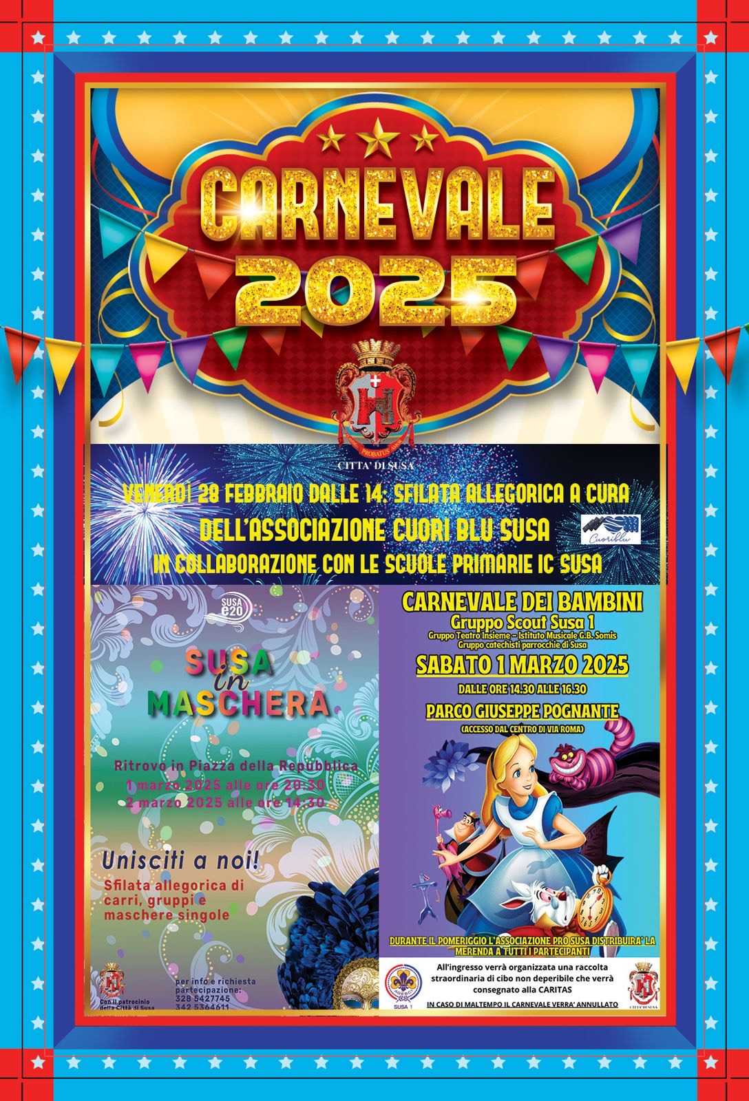 Il carnevale segusino ha inizio venerdì 28 febbraio dalle 14 : 00 con sfilata allegorica a cura Associazione Cuori Blu in collaborazione con le scuole Primarie IC Susa