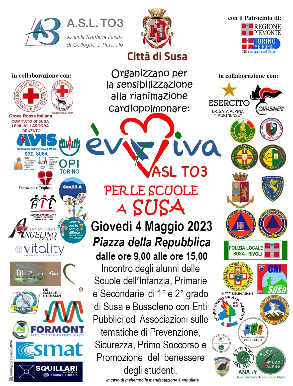 Manifestazione in piazza per la sensibilizzazione alla rianimazione cardiopolmonare, incentrata sulle tematiche di prevenzione, sicurezza, primo soccorso e promozione del benessere degli studenti, organizzata dall'ASL TO3 in collaborazione con la Città di Susa, con la partecipazione di Associazioni ed enti pubblici.