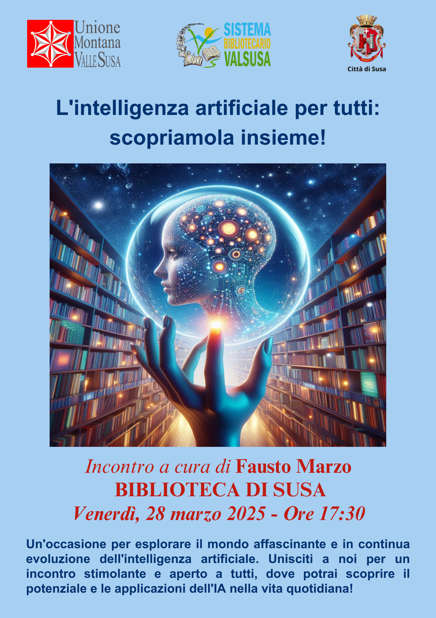 Un 'occasione per esplorare il mondo affascinante e in continua evoluzione dell'intelligenza artificiale. Unisciti a noi per un incontro stimolante e aperto a tutti, dove potrai scoprire il potenziale e le applicazioni dell' IA nella vita quotidiana !