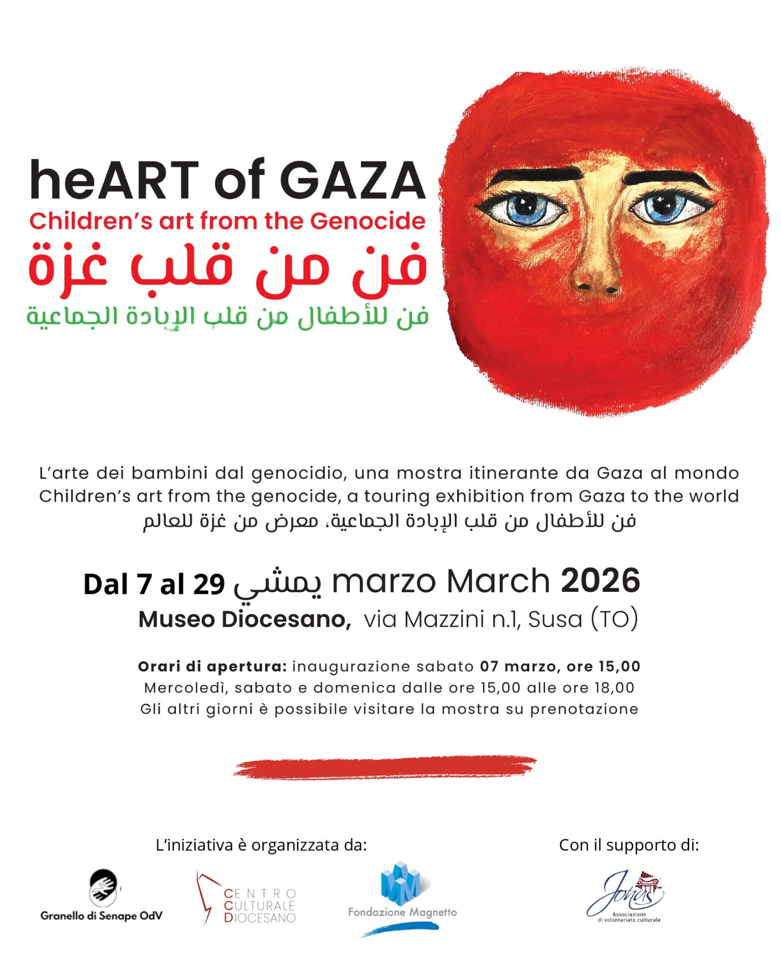 Fino a domenica 29 marzo 2026 le sale del Museo Diocesano segusino ospiteranno i disegni di bambini e ragazzi che vivono a Deir Al-Balah, nel centro della Striscia di Gaza. I lavori, realizzati nella "tenda degli artisti", raffigurano bombardamenti, la vita nei campi profughi e scene di quotidianità, spesso accompagnati da brevi testimonianze scritte.